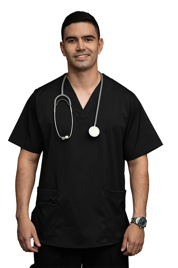 Camisa médico en tela antifluido negro, con cuello de pico, manga corta, silueta regular con aberturas laterales y dos bolsillos inferiores sencillos