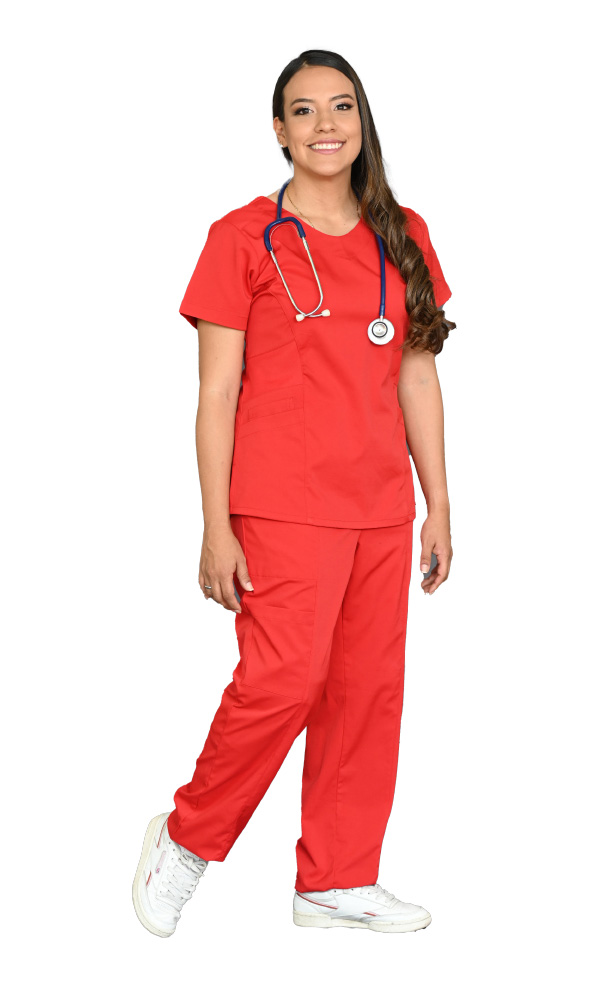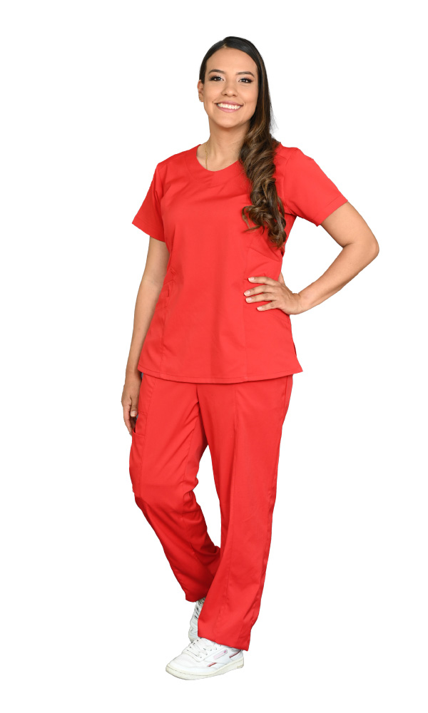 Medical blouse in red antifluid fabric, with a princess cut, round neck, short sleeves, side slits, regular slim silhouette, darts on the back and two simple pockets accompanied by an envelope pocket.